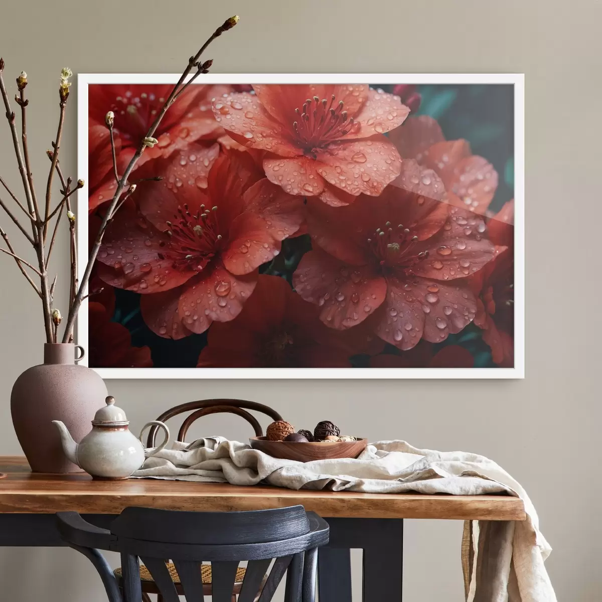 Plakatas Raudonos gėlės su rasos lašais f43878