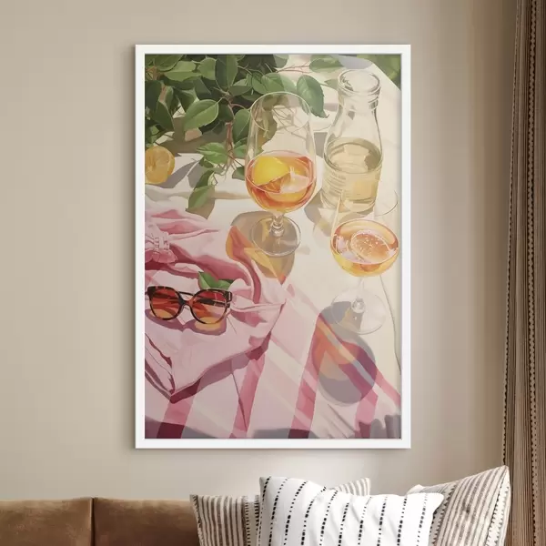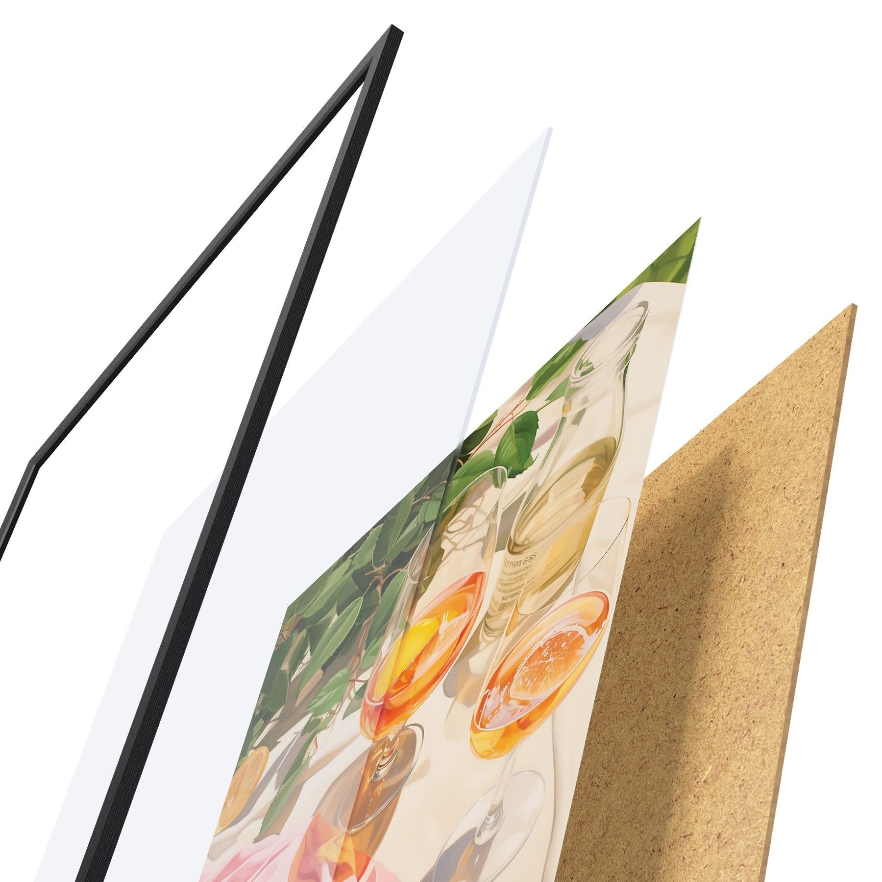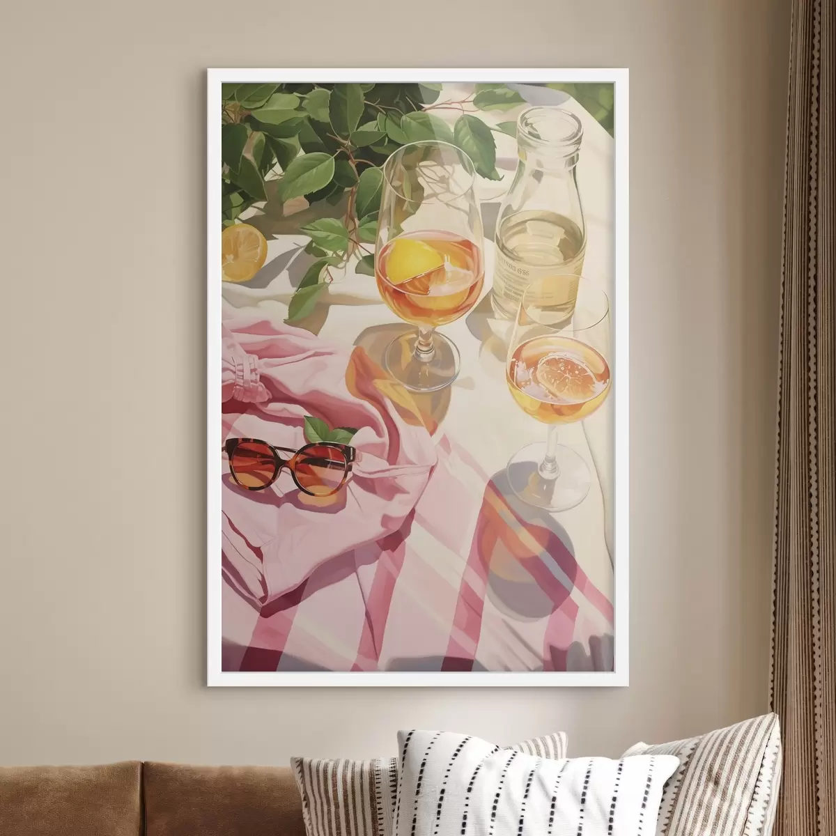 Plakatas Vasara, taurės su šampanu, žali augalai, šiltos spalvos Ne f43885