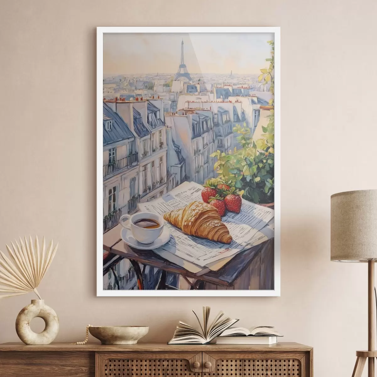 Plakatas Saulėtekis Paryžiaus balkone, Eifelio bokštas, braškės, kava, žurnalas f43890
