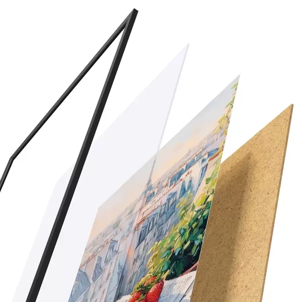 Plakatą sudaro rėmas, pleksiklas, atspausdintas vaizdas ir medžio drožlių plokštės pagrindas. Plakatą galima iš karto pakabinti ant sienos dėl kitoje pusėje esančių laikiklių.