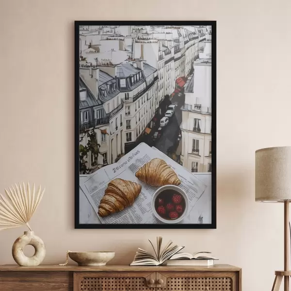 Plakatas Rytinė kava su kruasanais, miesto gatvė, architektūrinis, aliejinis stilius f43891