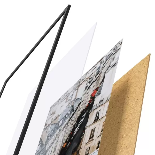 Plakatą sudaro rėmas, pleksiklas, atspausdintas vaizdas ir medžio drožlių plokštės pagrindas. Plakatą galima iš karto pakabinti ant sienos dėl kitoje pusėje esančių laikiklių.