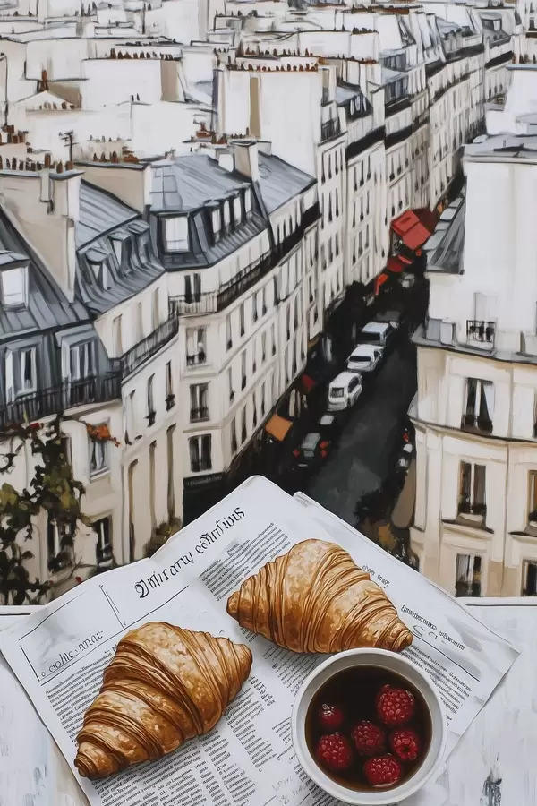 Plakatas Rytinė kava su kruasanais, miesto gatvė, architektūrinis, aliejinis stilius f43891