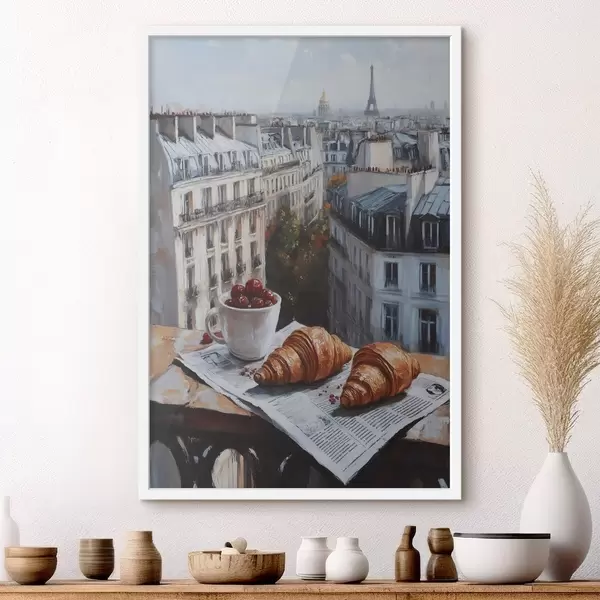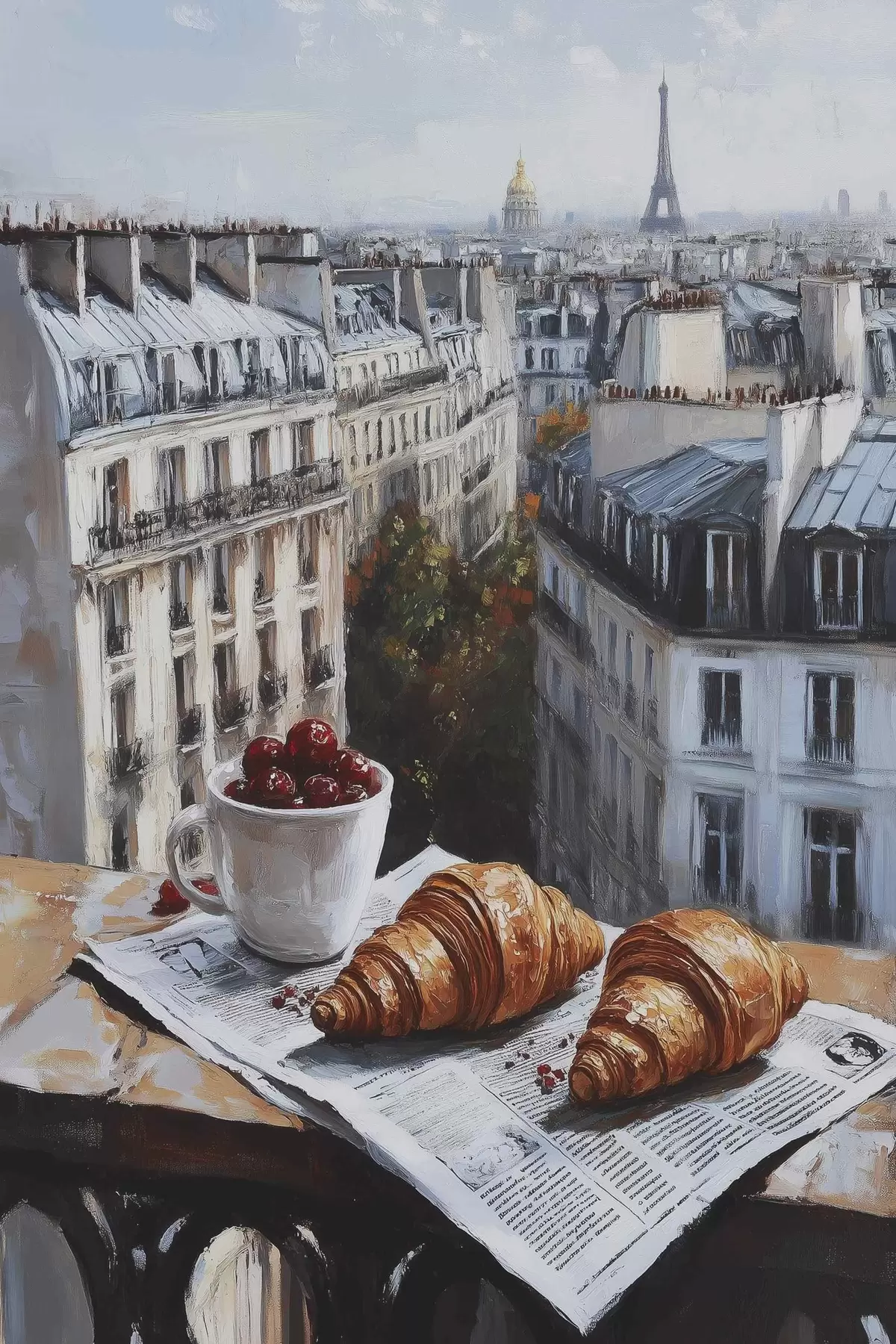 Plakatas Paryžiaus rytas, kava su kruasanais, miesto vaizdas, piešinys aliejiniais dažais f43892