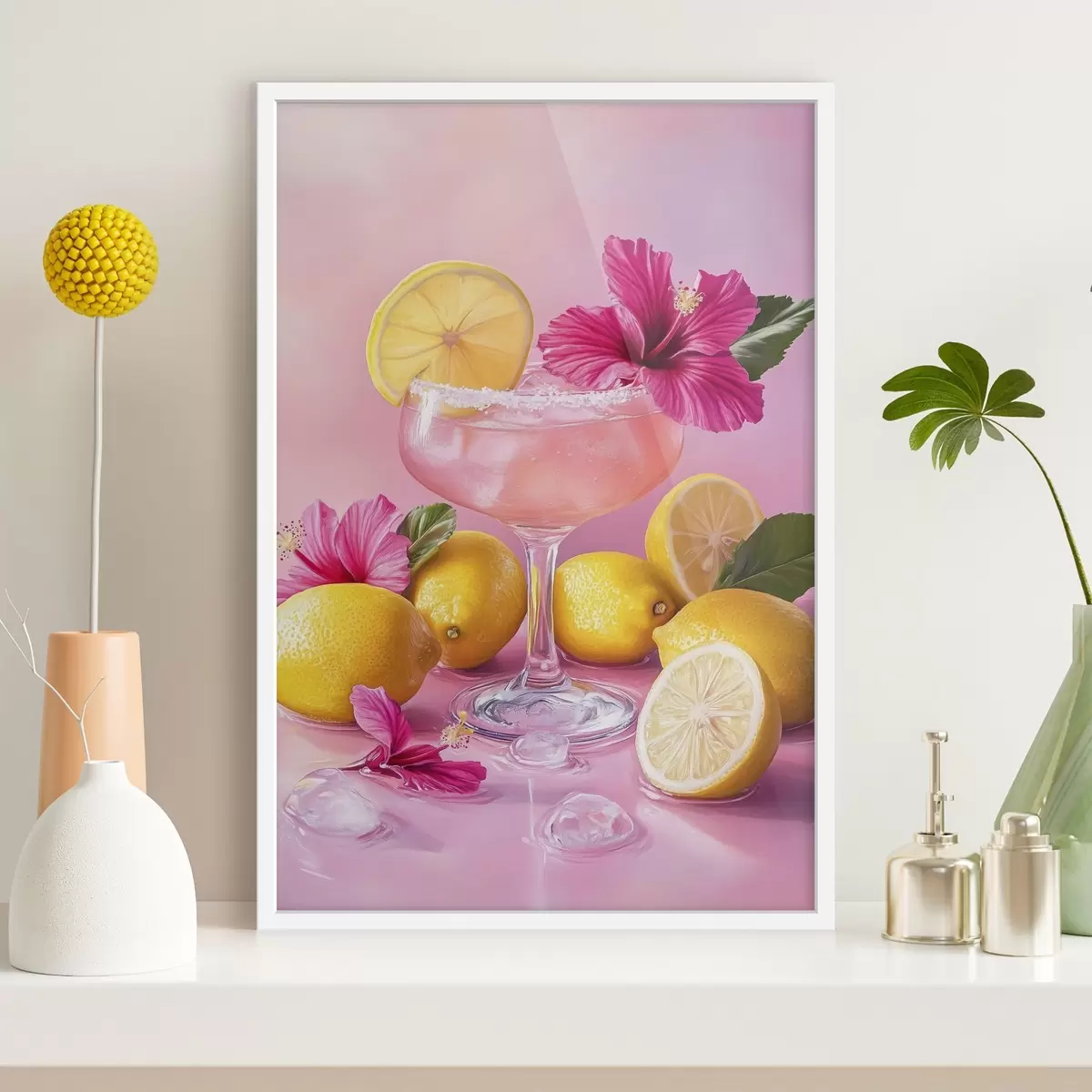 Plakatas Vasaros kokteilis su gėlėmis ir citrinomis, rožinės spalvos, akvarelės stilius Ne f43895