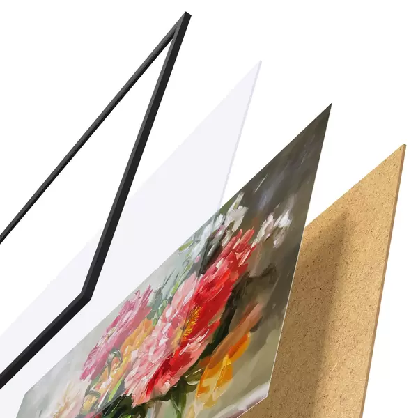 Plakatą sudaro rėmas, pleksiklas, atspausdintas vaizdas ir medžio drožlių plokštės pagrindas. Plakatą galima iš karto pakabinti ant sienos dėl kitoje pusėje esančių laikiklių.