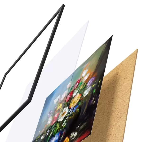 Plakatą sudaro rėmas, pleksiklas, atspausdintas vaizdas ir medžio drožlių plokštės pagrindas. Plakatą galima iš karto pakabinti ant sienos dėl kitoje pusėje esančių laikiklių.