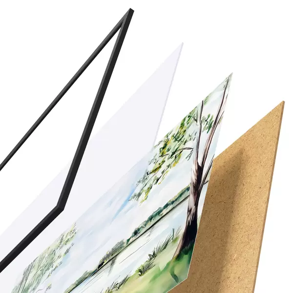Plakatą sudaro rėmas, pleksiklas, atspausdintas vaizdas ir medžio drožlių plokštės pagrindas. Plakatą galima iš karto pakabinti ant sienos dėl kitoje pusėje esančių laikiklių.