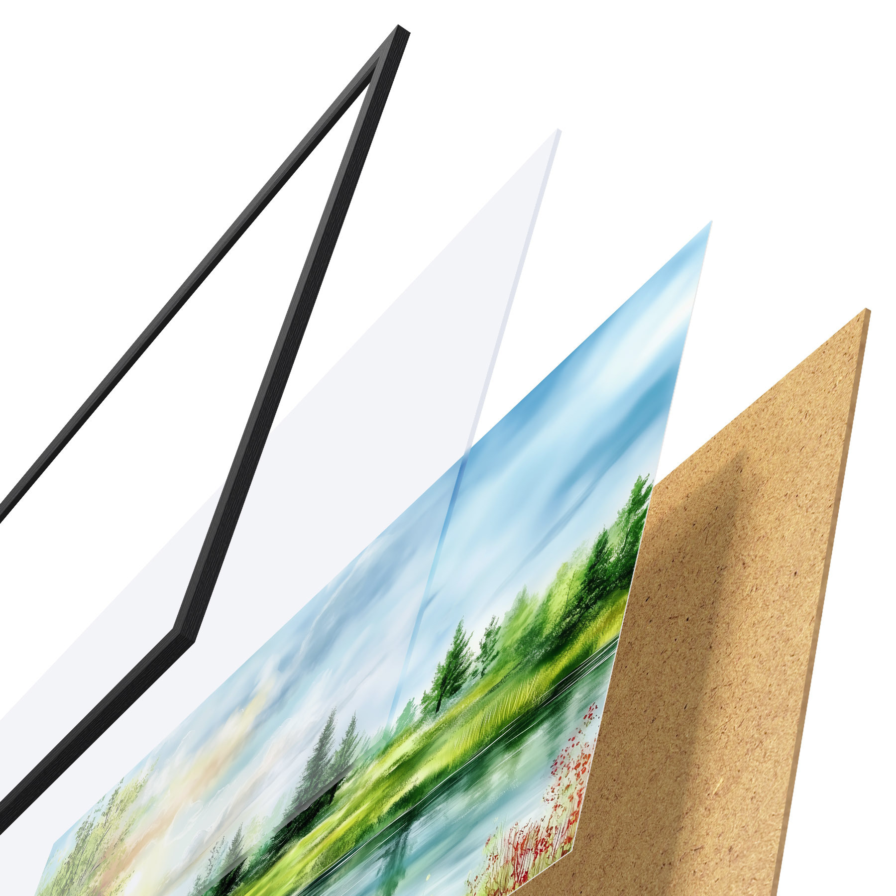 Plakatą sudaro rėmas, pleksiklas, atspausdintas vaizdas ir medžio drožlių plokštės pagrindas. Plakatą galima iš karto pakabinti ant sienos dėl kitoje pusėje esančių laikiklių.