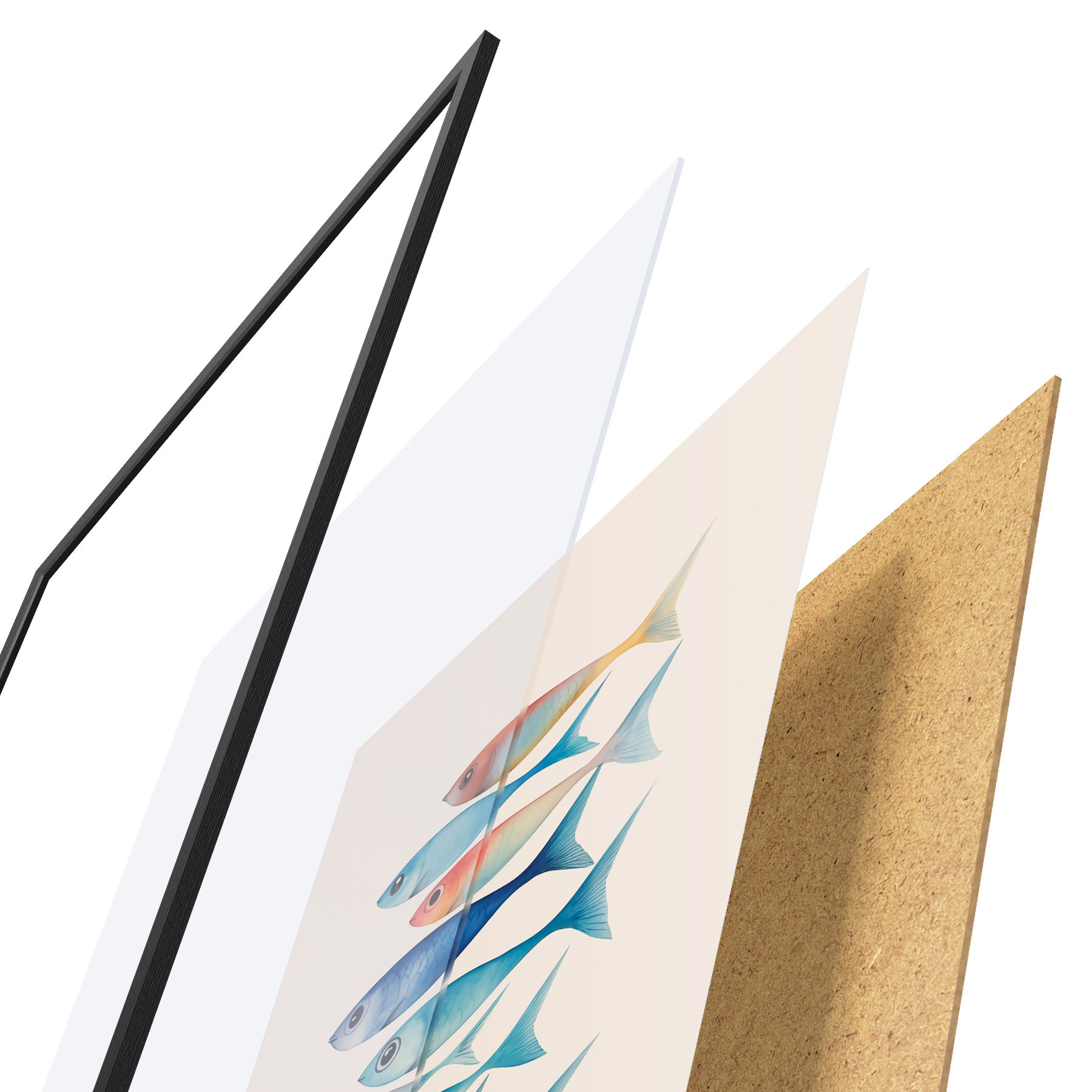 Plakatą sudaro rėmas, pleksiklas, atspausdintas vaizdas ir medžio drožlių plokštės pagrindas. Plakatą galima iš karto pakabinti ant sienos dėl kitoje pusėje esančių laikiklių.