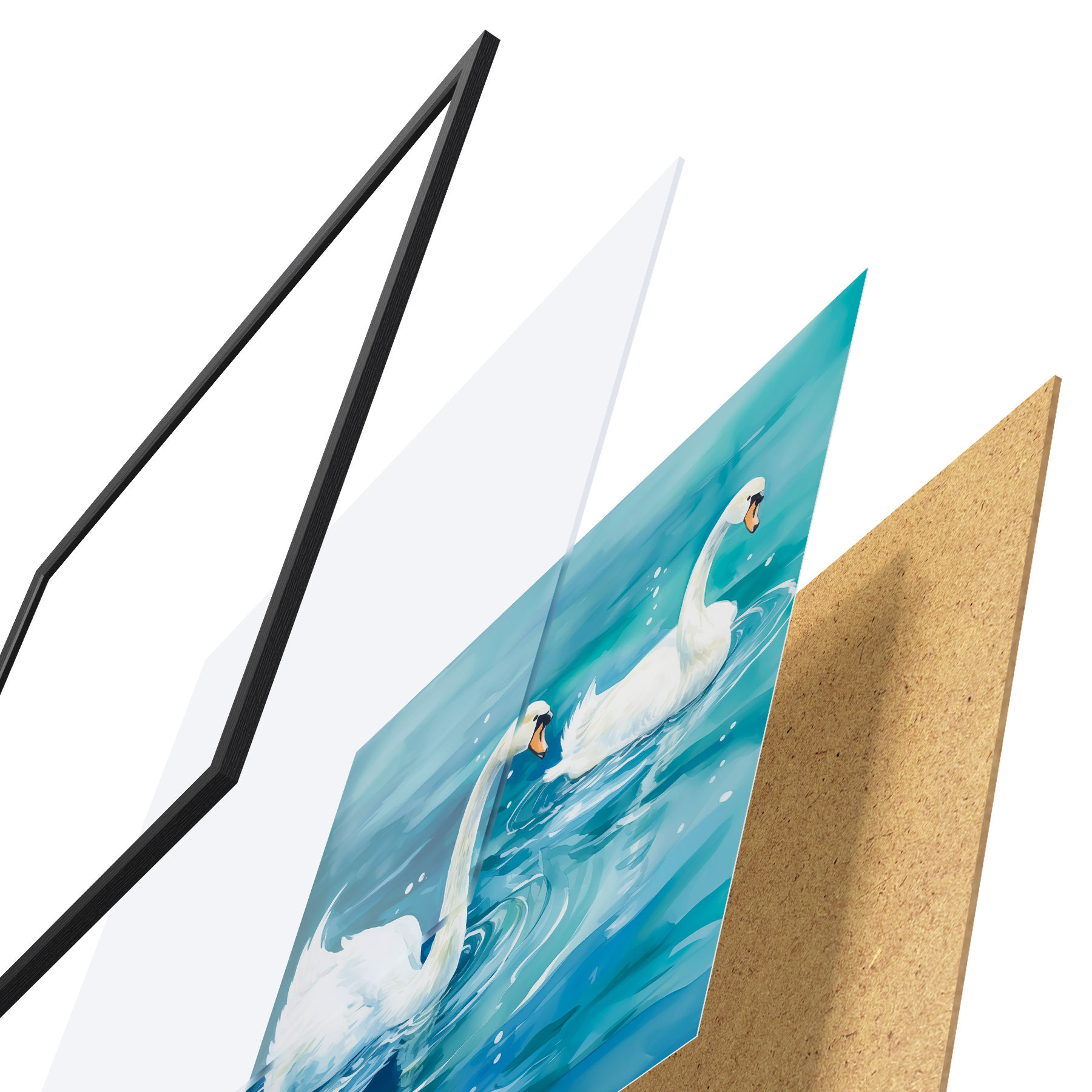 Plakatą sudaro rėmas, pleksiklas, atspausdintas vaizdas ir medžio drožlių plokštės pagrindas. Plakatą galima iš karto pakabinti ant sienos dėl kitoje pusėje esančių laikiklių.