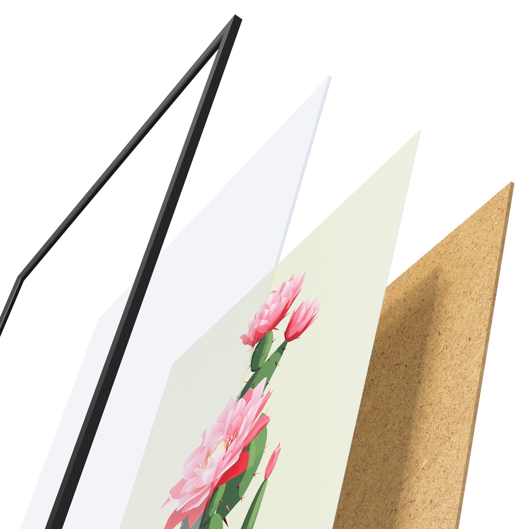 Plakatą sudaro rėmas, pleksiklas, atspausdintas vaizdas ir medžio drožlių plokštės pagrindas. Plakatą galima iš karto pakabinti ant sienos dėl kitoje pusėje esančių laikiklių.