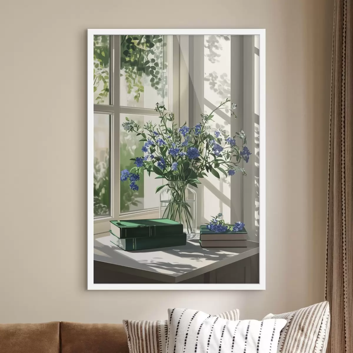 Plakatas Knygos ir violetinės gėlės vazoje ant palangės, žaluma Ne f44008