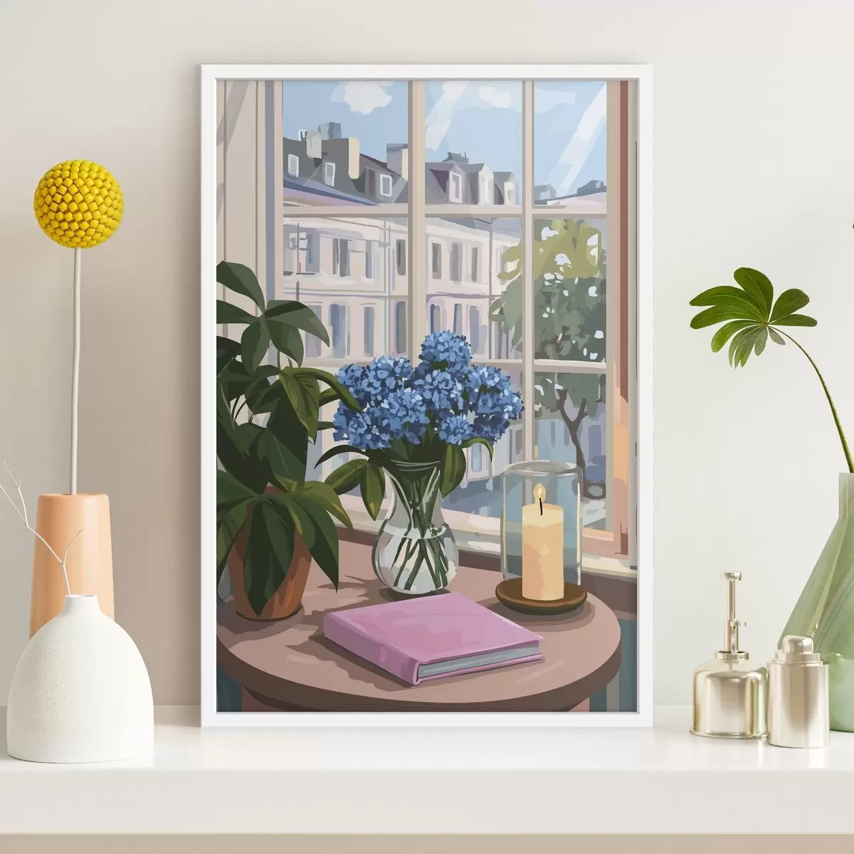 Plakatas Hortenzijos vazoje, vaizdas pro langą, žvakė, jaukūs namai f44009