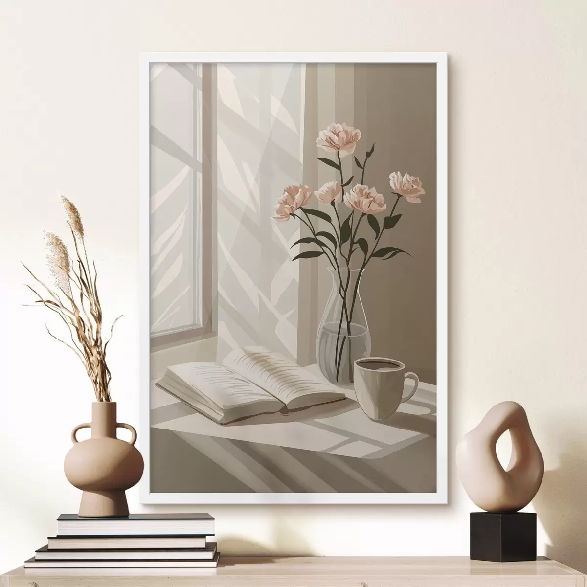 Plakatas Jaukus rytas su kava ir knyga, rožinės gėlės, abstrakcija Ne f44013