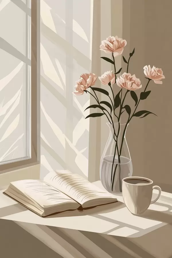 Plakatas Jaukus rytas su kava ir knyga, rožinės gėlės, abstrakcija Ne f44013