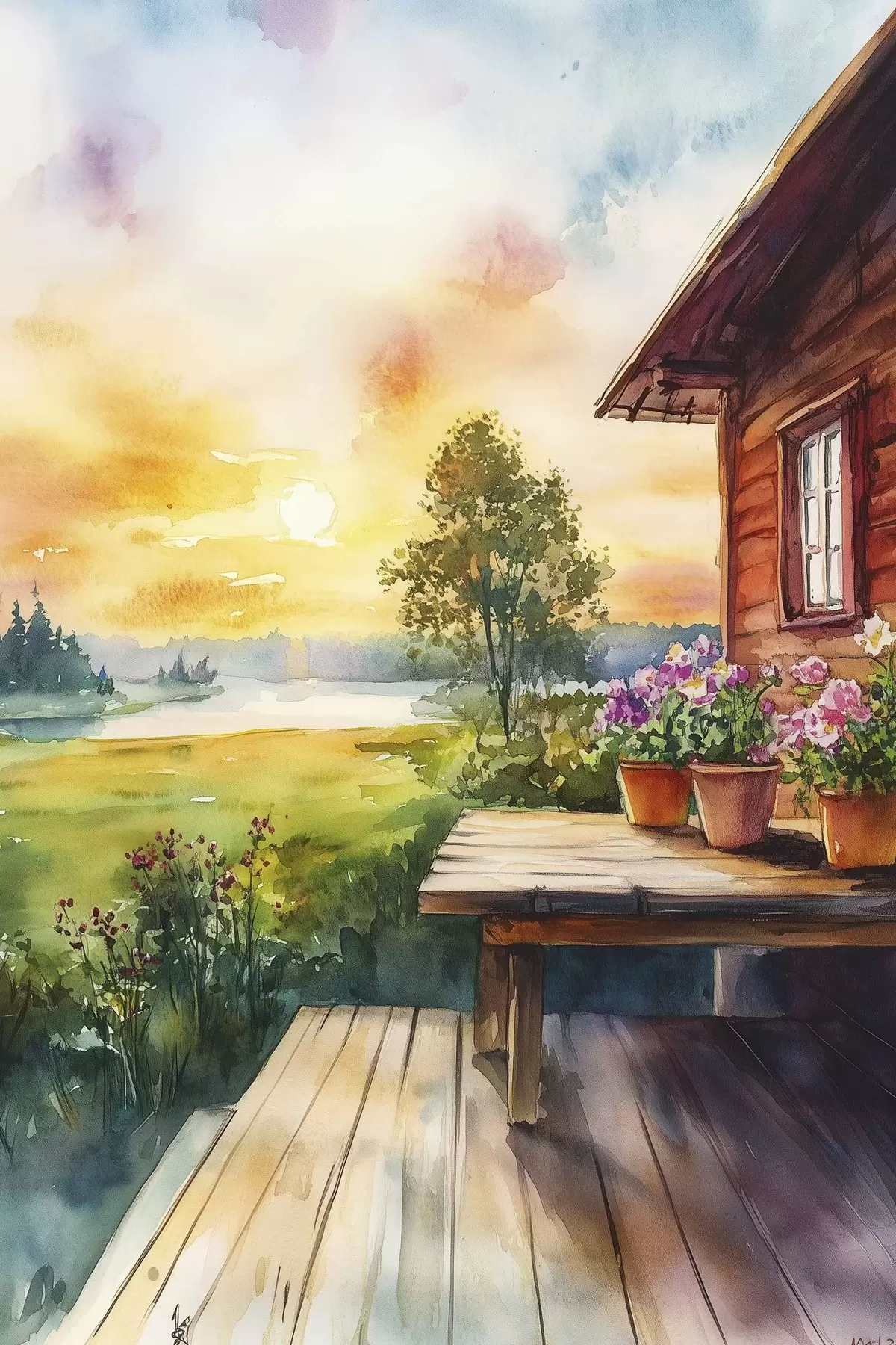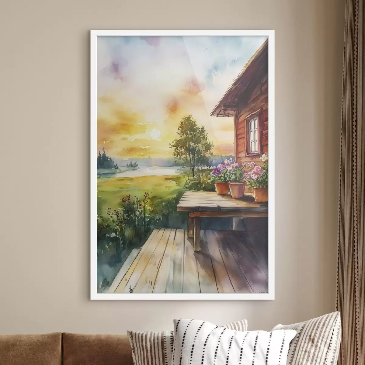 Plakatas Saulėlydžio spalvos, ūkis, akvarelės stilius, kaimiškas, vasaros gėlės f44017