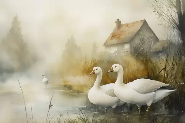 Plakatas Žąsys ežere netoli sodybos, kaimiškas, akvarelės stilius f44022