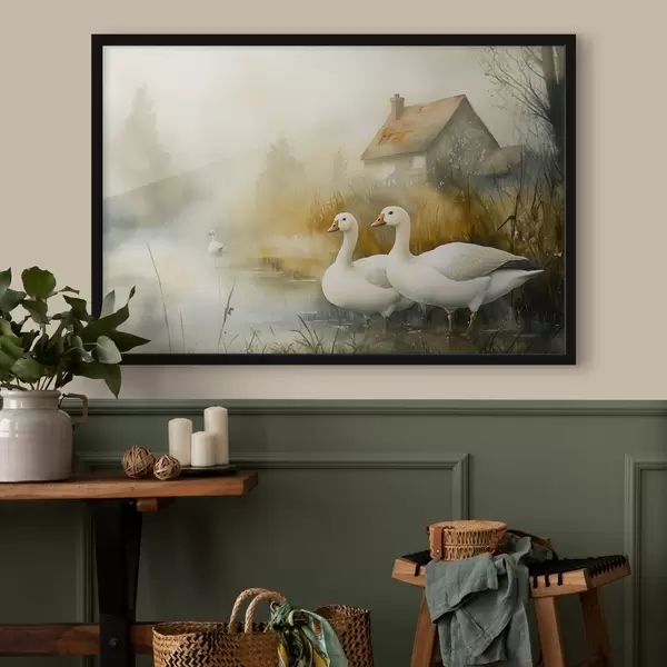 Plakatas Žąsys ežere netoli sodybos, kaimiškas, akvarelės stilius Ne f44022