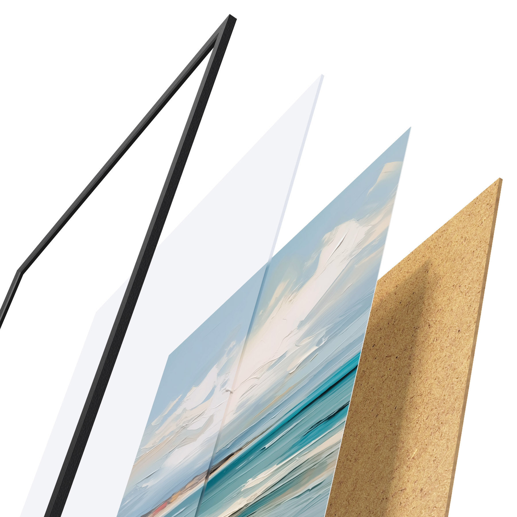Plakatą sudaro rėmas, pleksiklas, atspausdintas vaizdas ir medžio drožlių plokštės pagrindas. Plakatą galima iš karto pakabinti ant sienos dėl kitoje pusėje esančių laikiklių.