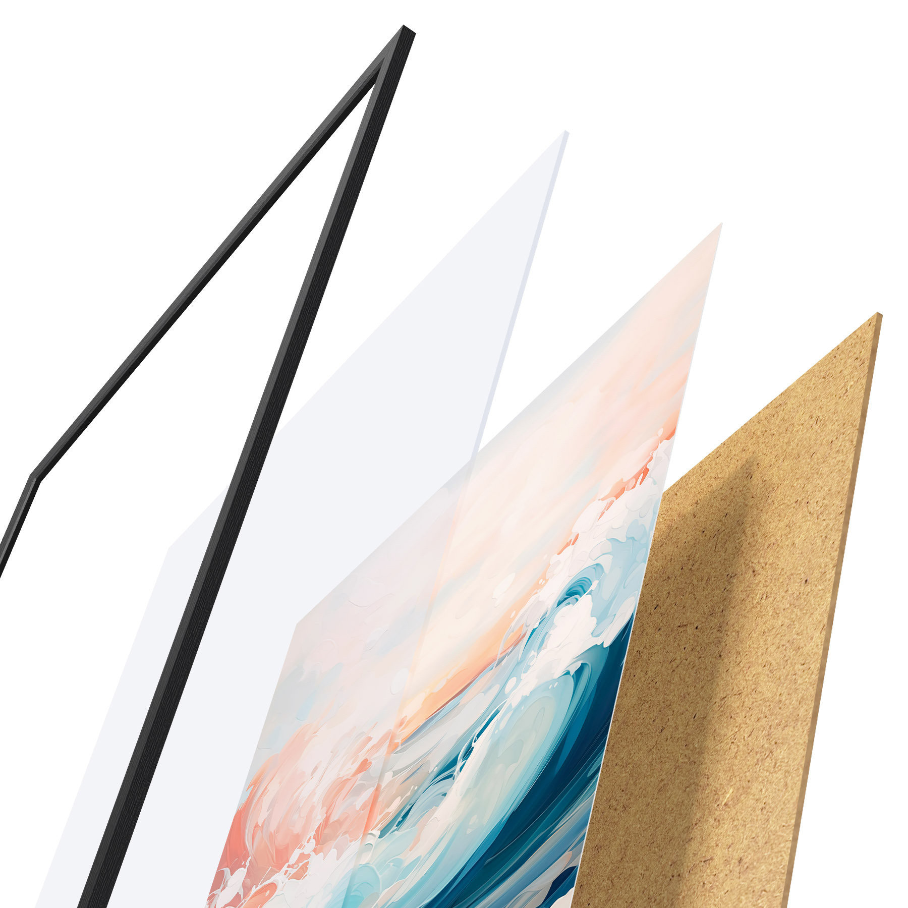 Plakatą sudaro rėmas, pleksiklas, atspausdintas vaizdas ir medžio drožlių plokštės pagrindas. Plakatą galima iš karto pakabinti ant sienos dėl kitoje pusėje esančių laikiklių.