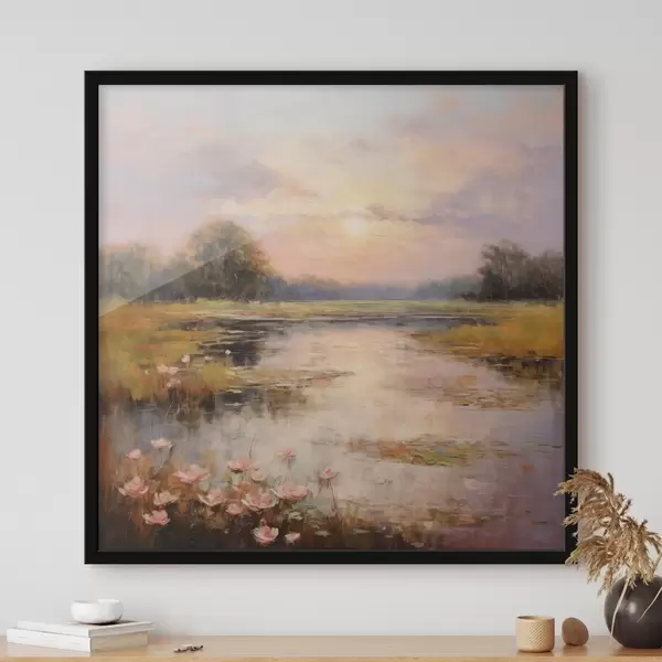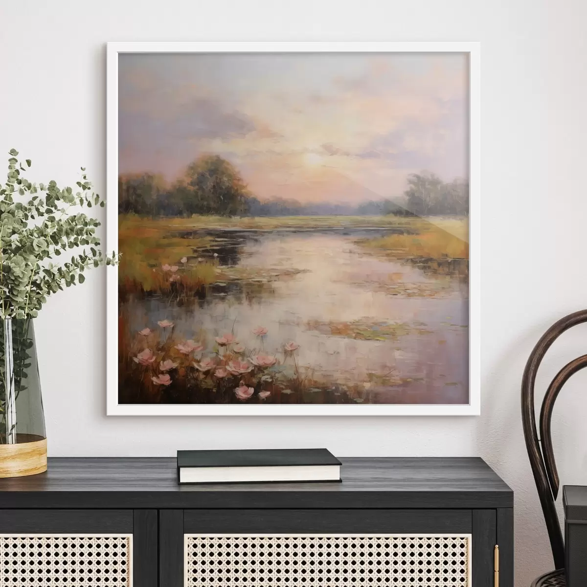 Plakatas Vandens telkinys su gėlėmis saulėlydžio metu f44044