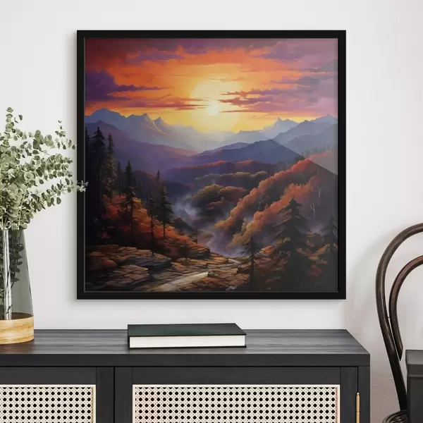 Plakatas Miškas ir kalnai saulėlydžio metu f44045