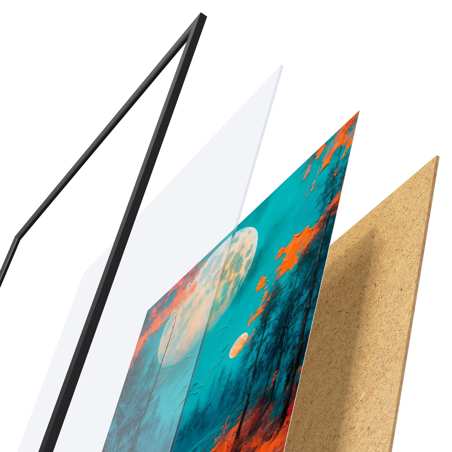 Plakatą sudaro rėmas, pleksiklas, atspausdintas vaizdas ir medžio drožlių plokštės pagrindas. Plakatą galima iš karto pakabinti ant sienos dėl kitoje pusėje esančių laikiklių.