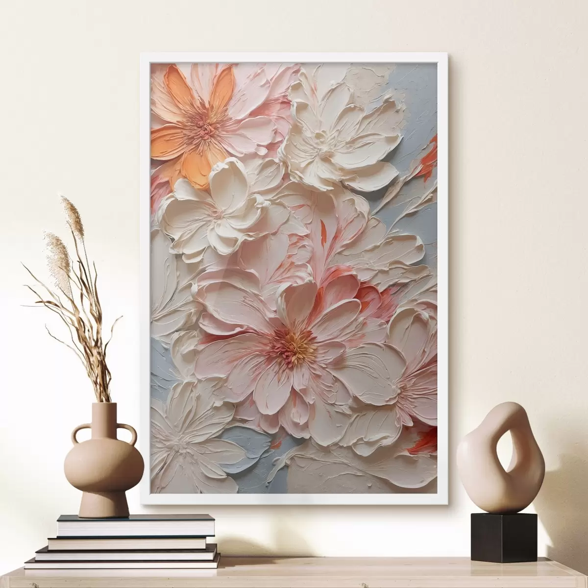 Plakatas Baltos ir rožinės gėlės mėlyname fone aliejinės tapybos stiliumi f44074