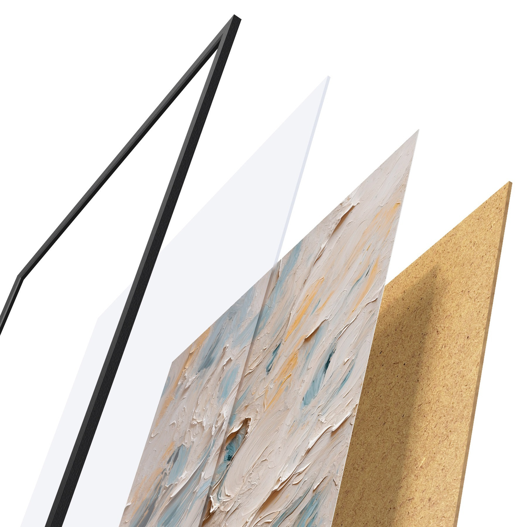 Plakatą sudaro rėmas, pleksiklas, atspausdintas vaizdas ir medžio drožlių plokštės pagrindas. Plakatą galima iš karto pakabinti ant sienos dėl kitoje pusėje esančių laikiklių.