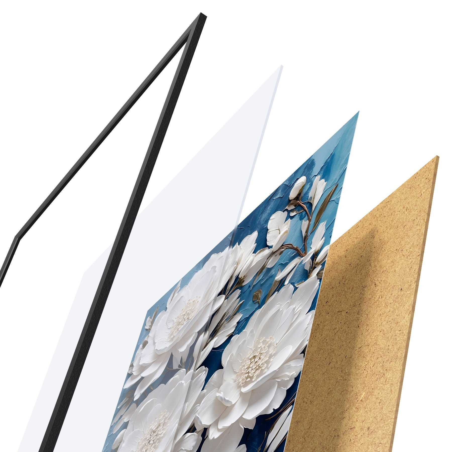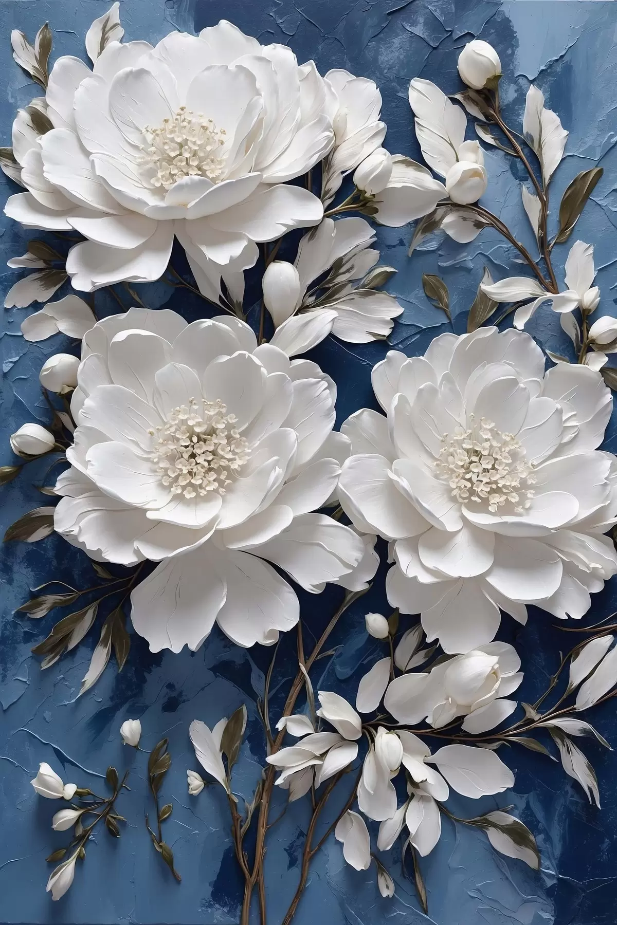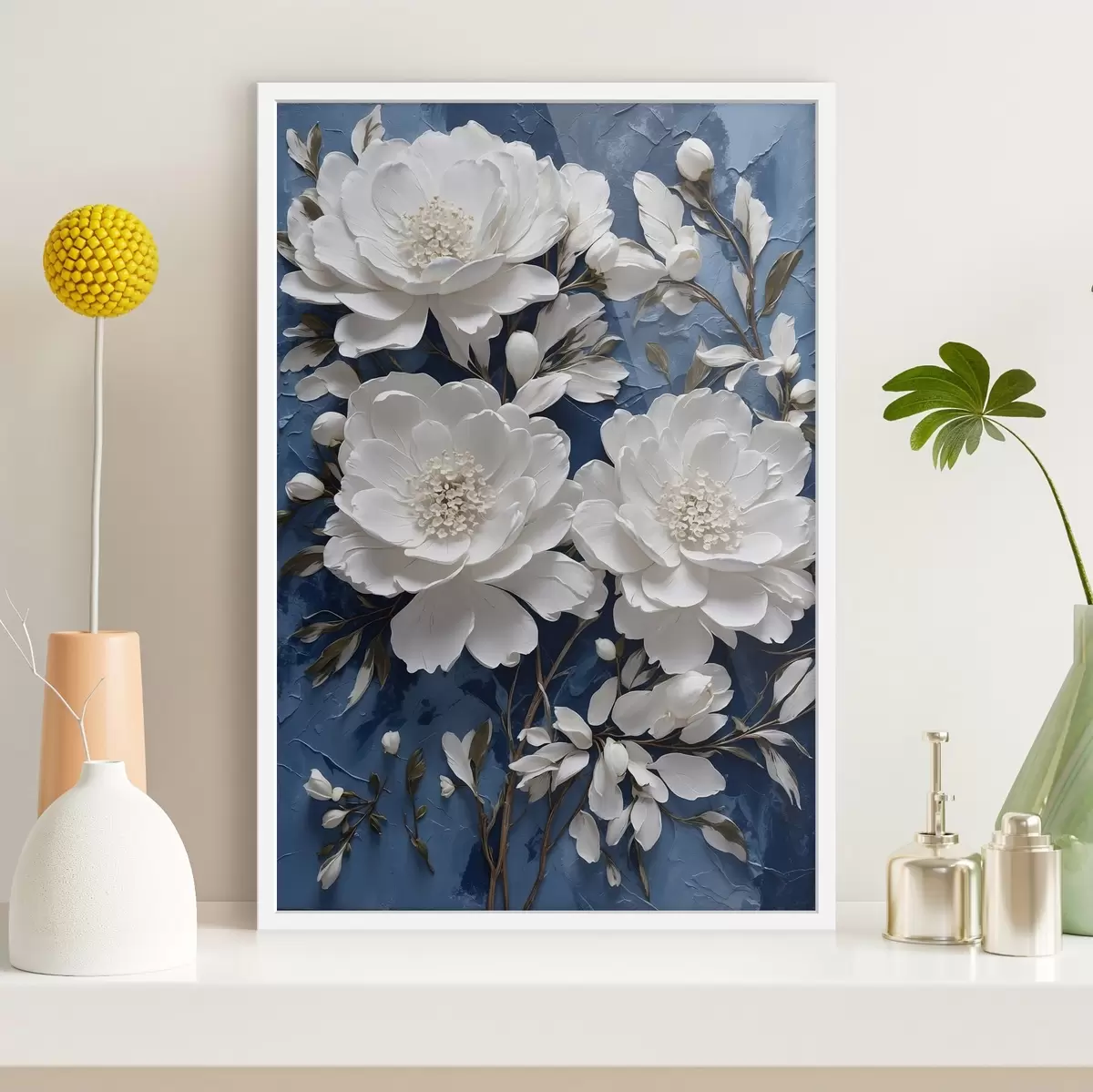 Plakatas Baltos gėlės ant mėlyno aliejaus tapybai fono f44091