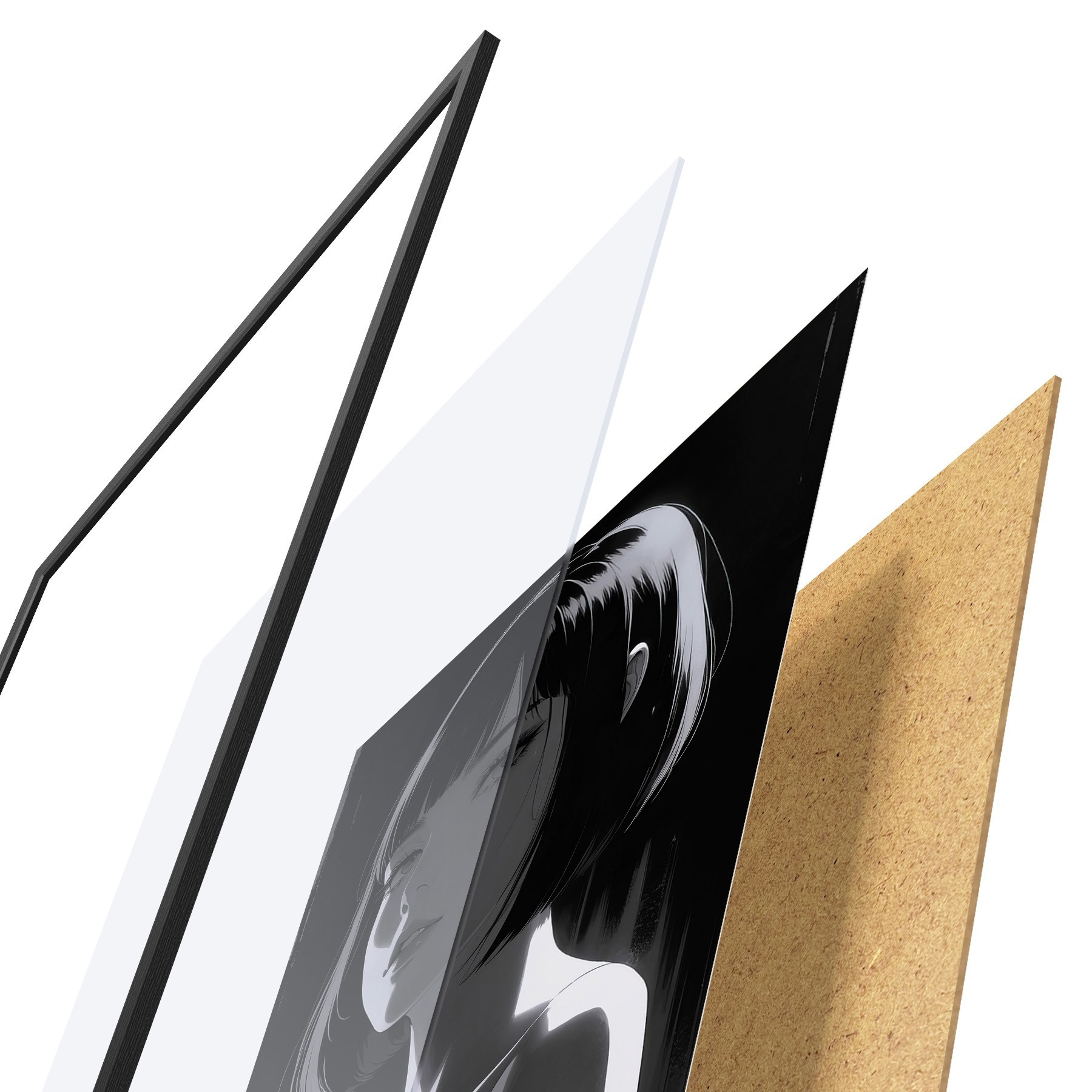 Plakatą sudaro rėmas, pleksiklas, atspausdintas vaizdas ir medžio drožlių plokštės pagrindas. Plakatą galima iš karto pakabinti ant sienos dėl kitoje pusėje esančių laikiklių.