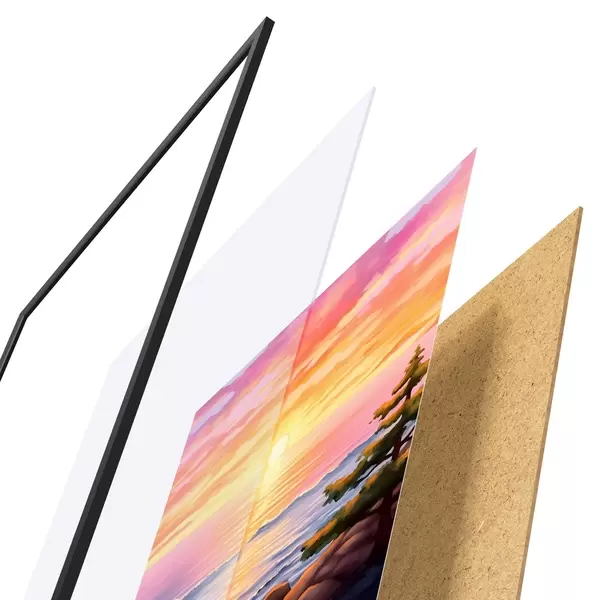 Plakatą sudaro rėmas, pleksiklas, atspausdintas vaizdas ir medžio drožlių plokštės pagrindas. Plakatą galima iš karto pakabinti ant sienos dėl kitoje pusėje esančių laikiklių.