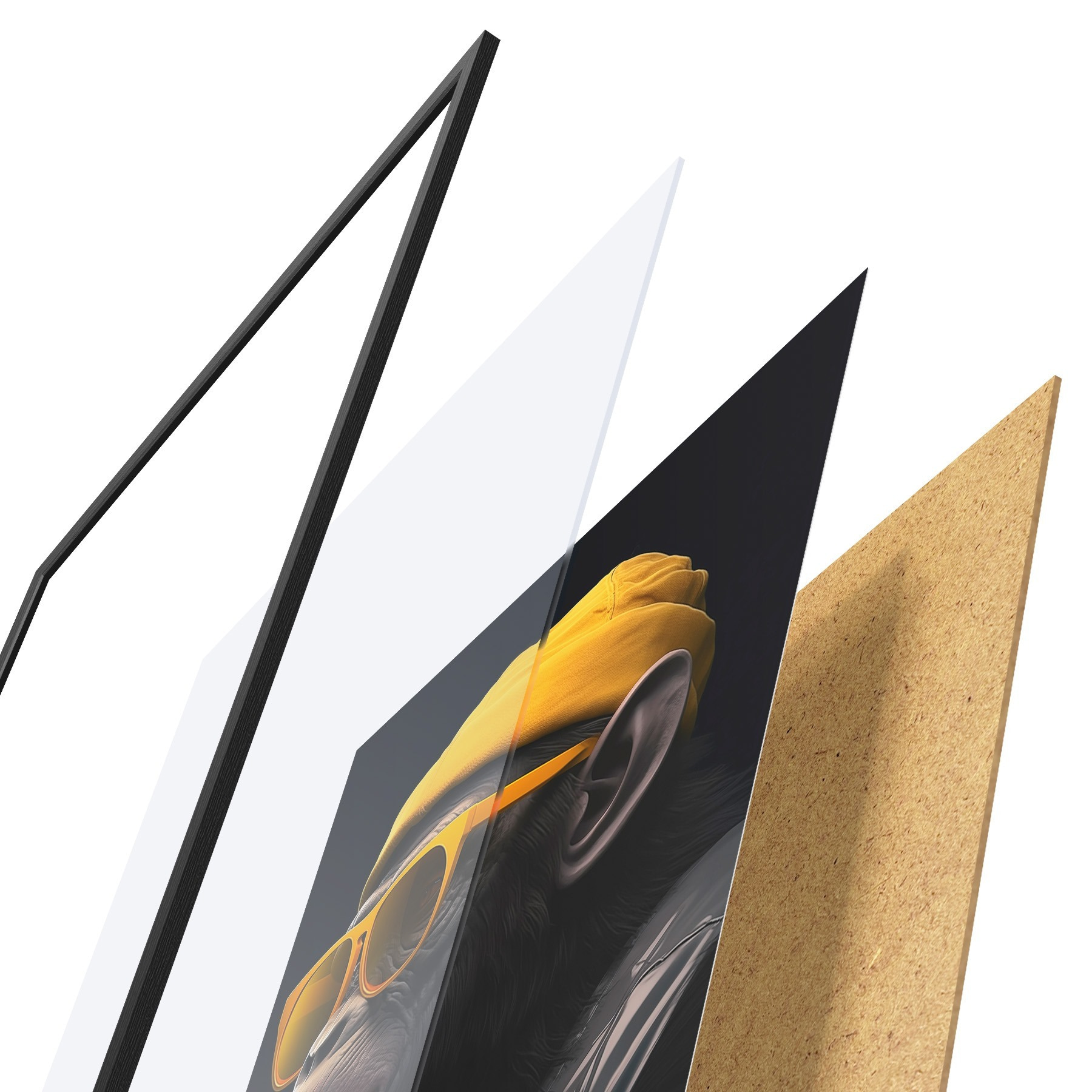 Plakatą sudaro rėmas, pleksiklas, atspausdintas vaizdas ir medžio drožlių plokštės pagrindas. Plakatą galima iš karto pakabinti ant sienos dėl kitoje pusėje esančių laikiklių.