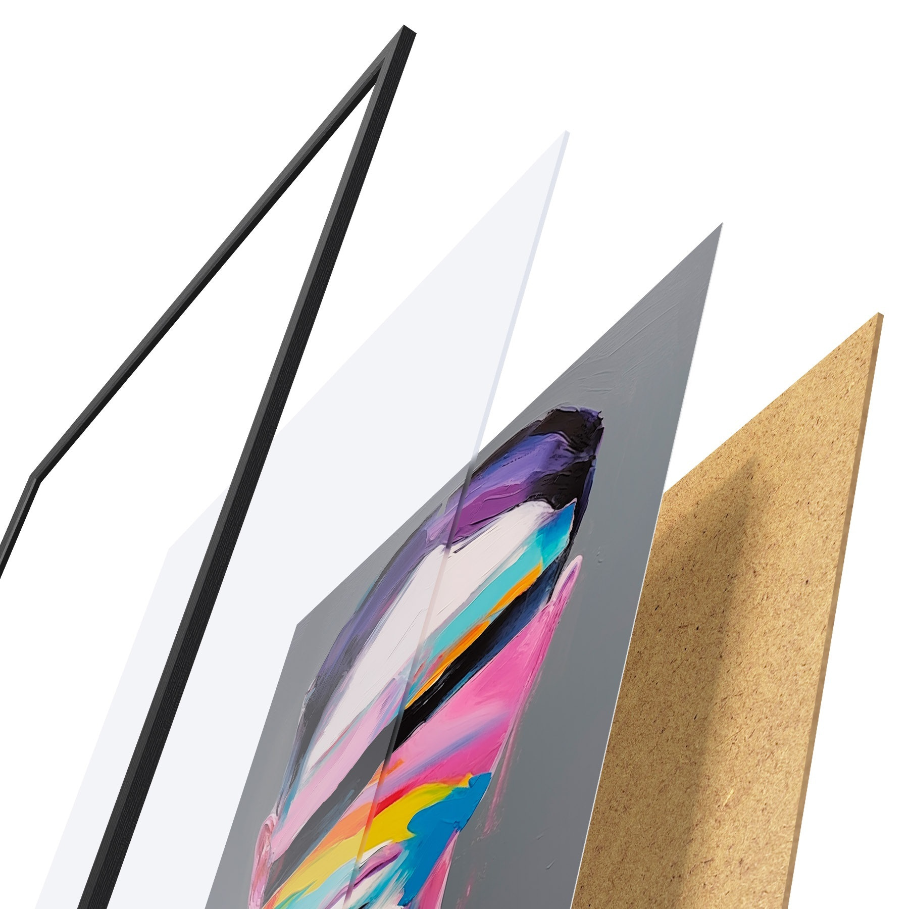 Plakatą sudaro rėmas, pleksiklas, atspausdintas vaizdas ir medžio drožlių plokštės pagrindas. Plakatą galima iš karto pakabinti ant sienos dėl kitoje pusėje esančių laikiklių.