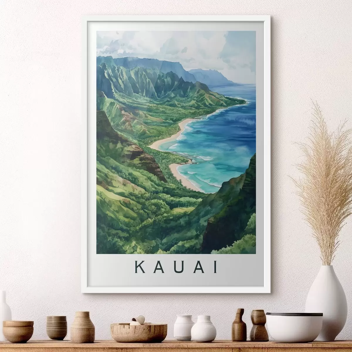 Plakatas Žalieji kalnai, Havajai, vandenynas, tropinis, akvarelės stilius Ne f44143