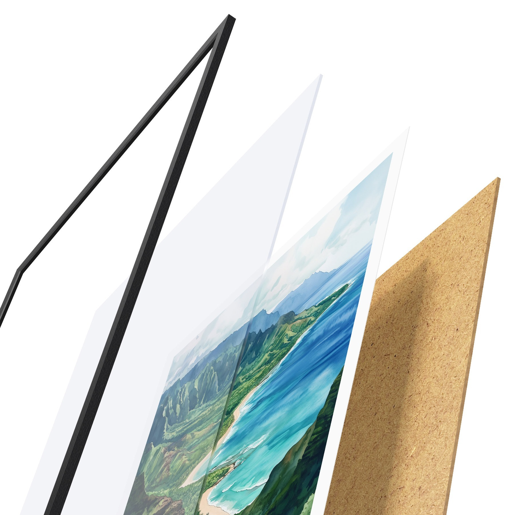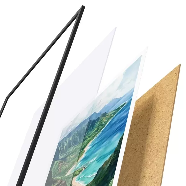 Plakatą sudaro rėmas, pleksiklas, atspausdintas vaizdas ir medžio drožlių plokštės pagrindas. Plakatą galima iš karto pakabinti ant sienos dėl kitoje pusėje esančių laikiklių.