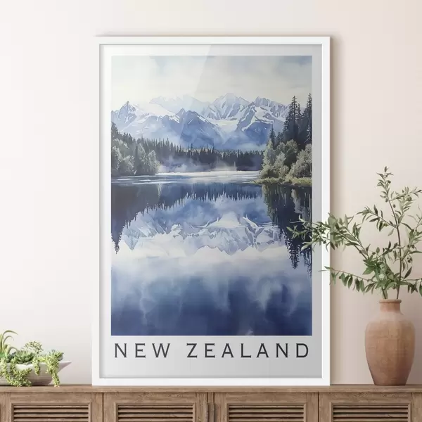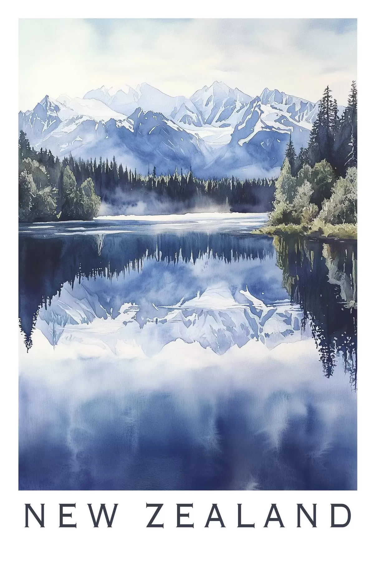 Plakatas Gražūs kalnai Naujojoje Zelandijoje, akvarelės stilius, ežeras, miškas Ne f44144