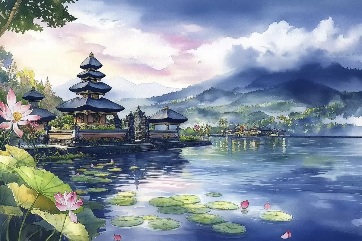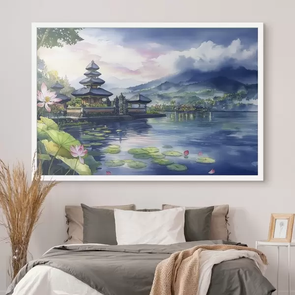 Plakatas Indonezijos sala, šventykla, budizmas, atogrąžų gamta, akvarelės stilius Ne f44148