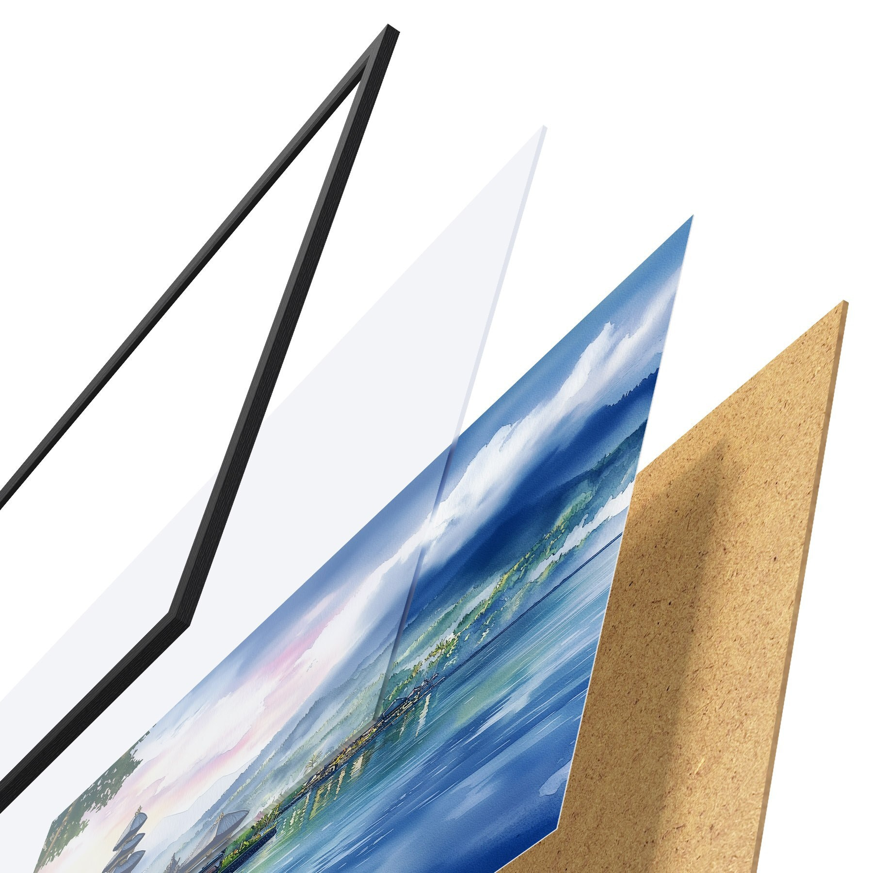 Plakatą sudaro rėmas, pleksiklas, atspausdintas vaizdas ir medžio drožlių plokštės pagrindas. Plakatą galima iš karto pakabinti ant sienos dėl kitoje pusėje esančių laikiklių.