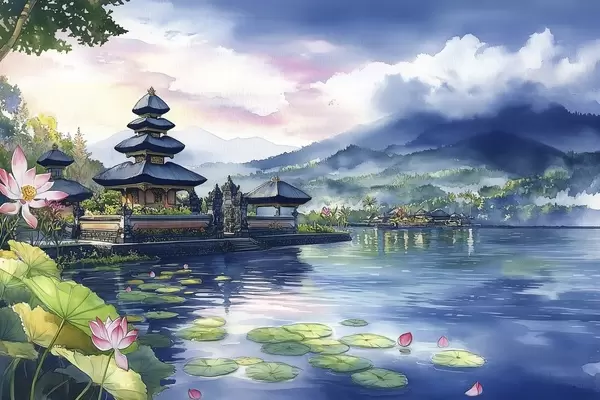 Plakatas Indonezijos sala, šventykla, budizmas, atogrąžų gamta, akvarelės stilius f44148