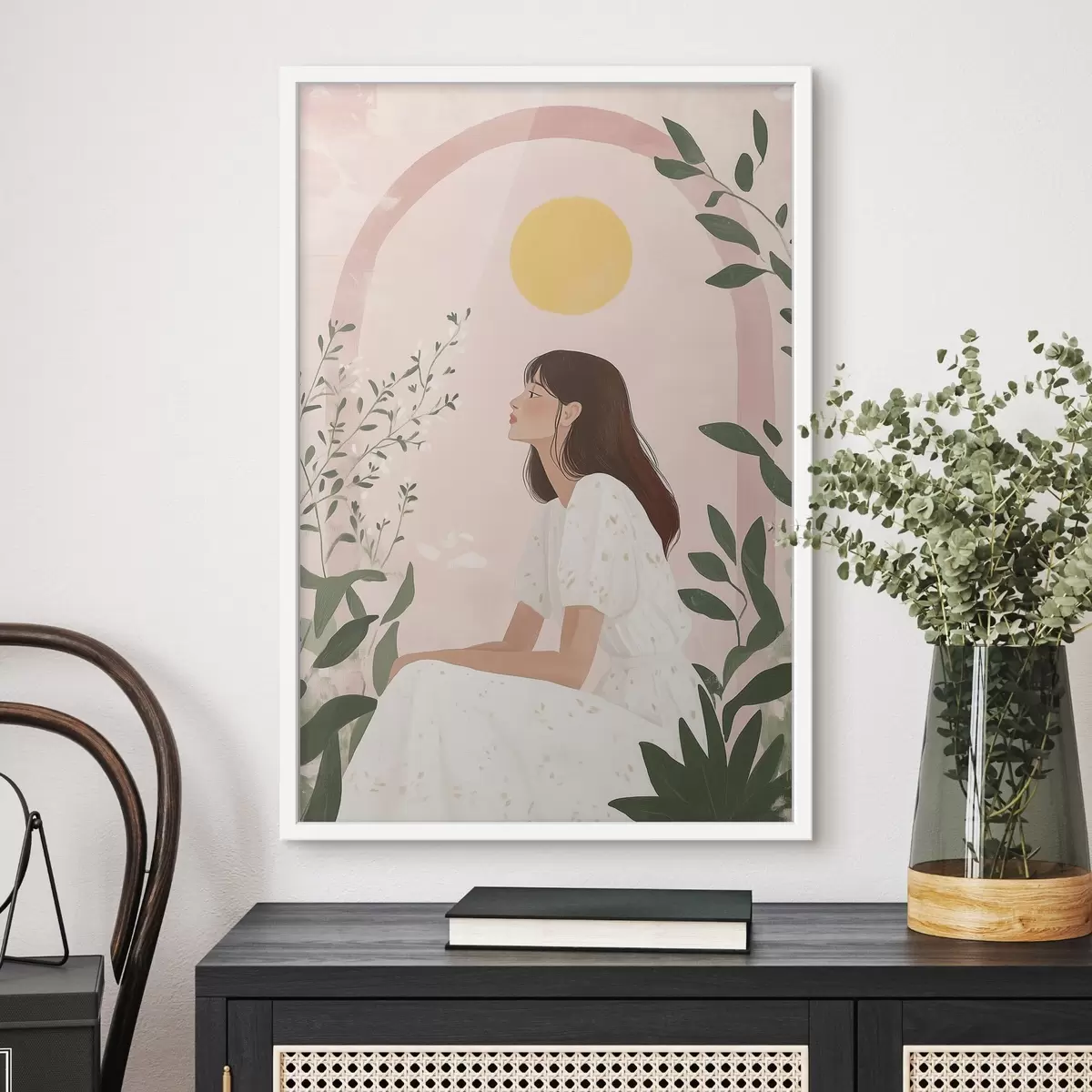 Plakatas Graži moteris atogrąžų sode, saulė, pastelinės spalvos f44155