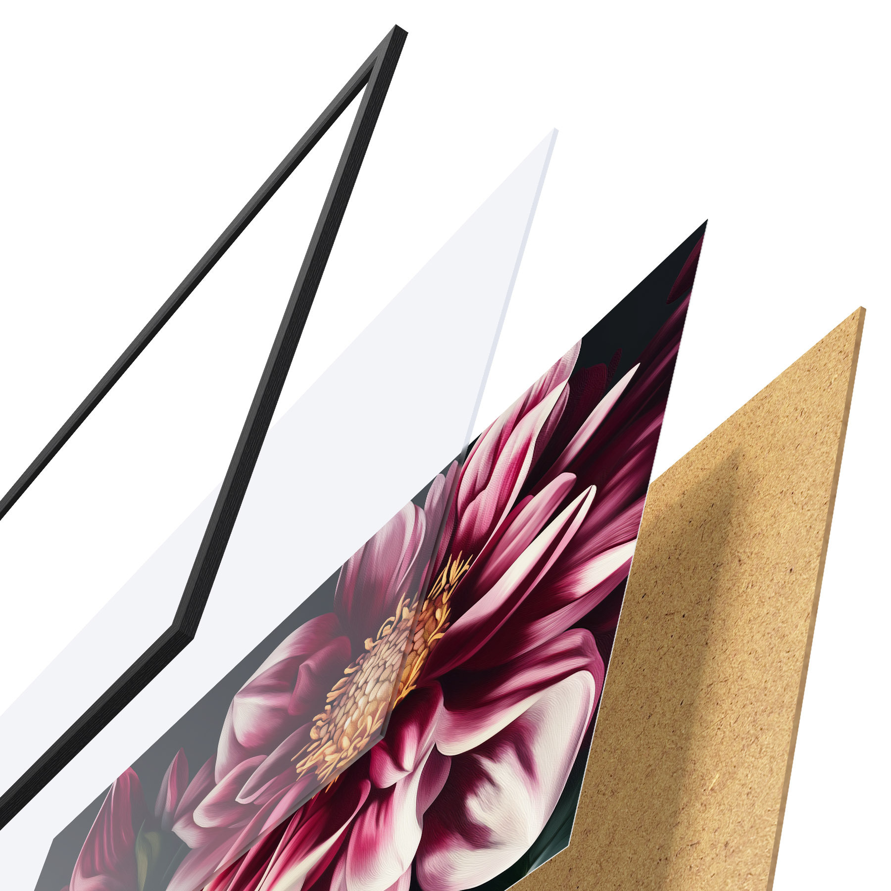 Plakatą sudaro rėmas, pleksiklas, atspausdintas vaizdas ir medžio drožlių plokštės pagrindas. Plakatą galima iš karto pakabinti ant sienos dėl kitoje pusėje esančių laikiklių.