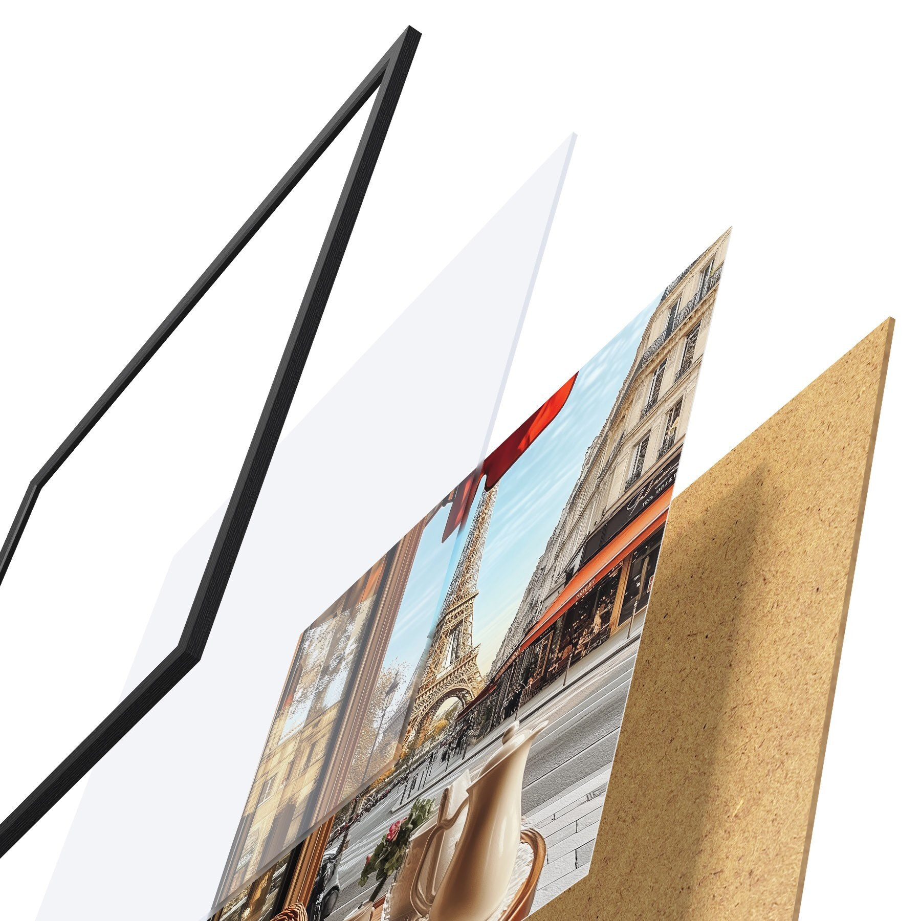 Plakatą sudaro rėmas, pleksiklas, atspausdintas vaizdas ir medžio drožlių plokštės pagrindas. Plakatą galima iš karto pakabinti ant sienos dėl kitoje pusėje esančių laikiklių.