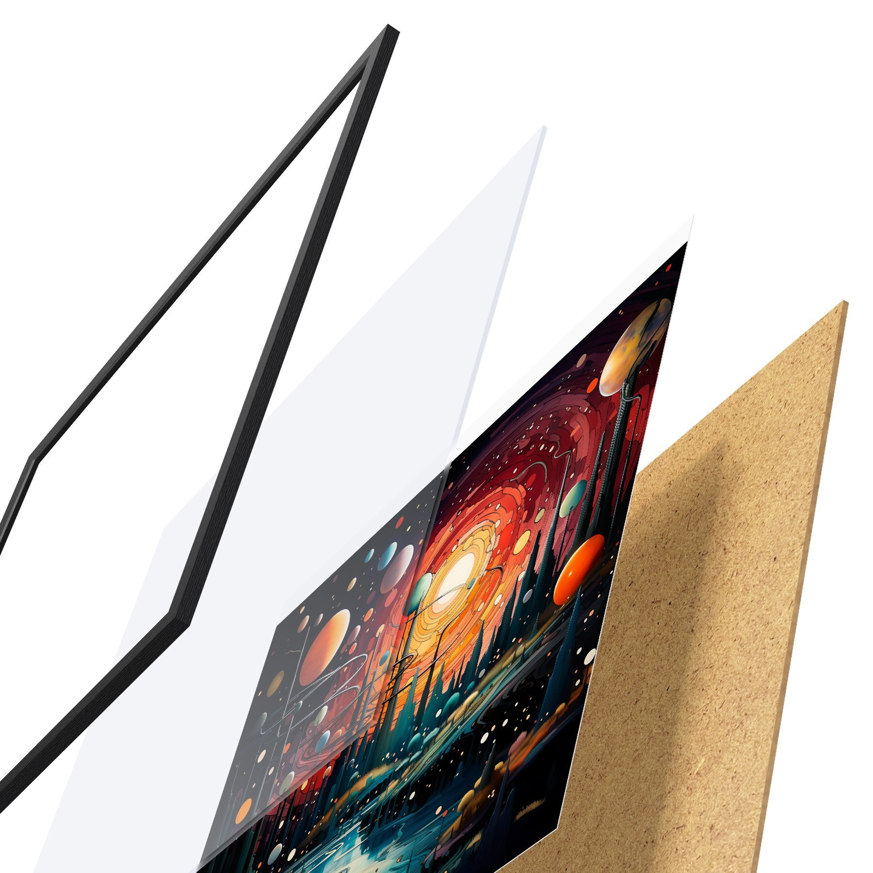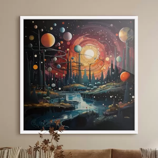 Plakatas Ryškus ir fantastiškas svetimo pasaulio kraštovaizdis su planetomis ir upe Ne f44249