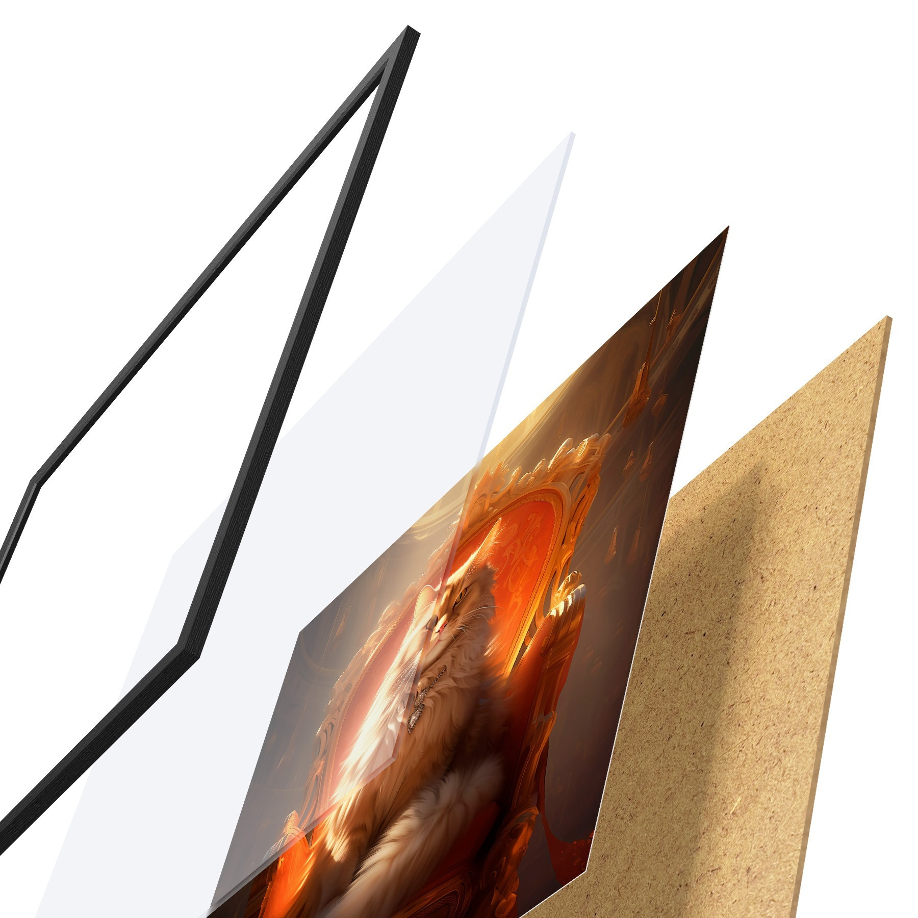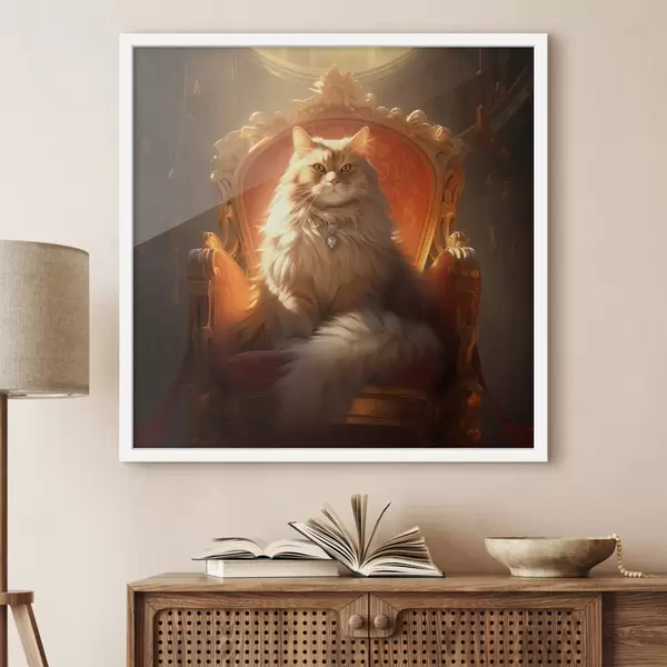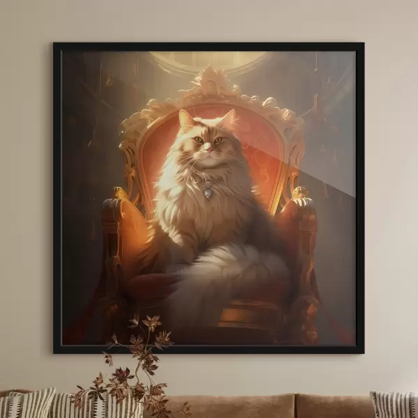 Plakatas Karališkas katinas gintarinėmis akimis ant sosto šlovės spinduliuose barokinio stiliaus soste f44250