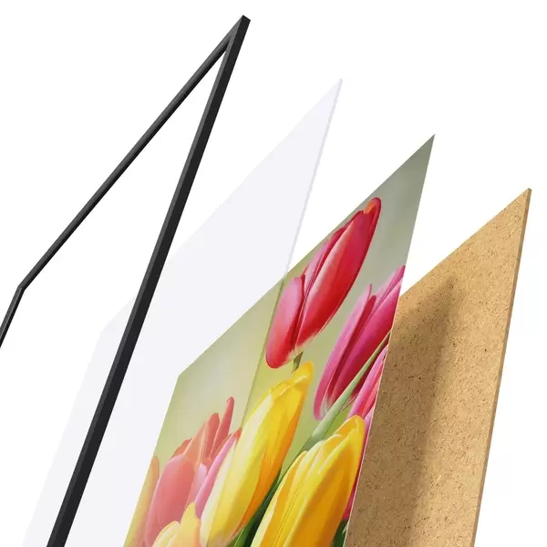Plakatą sudaro rėmas, pleksiklas, atspausdintas vaizdas ir medžio drožlių plokštės pagrindas. Plakatą galima iš karto pakabinti ant sienos dėl kitoje pusėje esančių laikiklių.