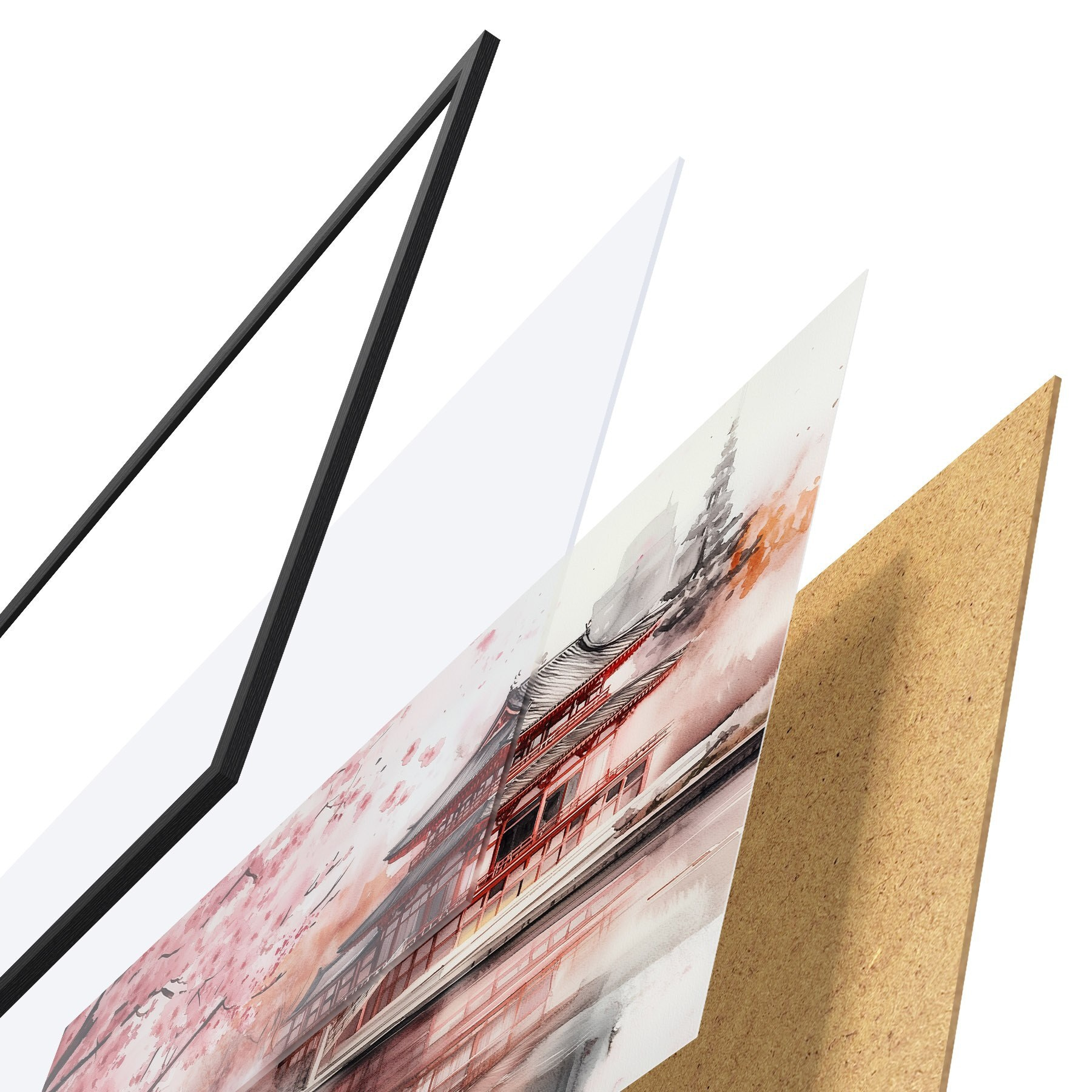 Plakatas Gražus Japonijos kraštovaizdis su žydinčia vyšnia ir namu prie ežero Ne f44310