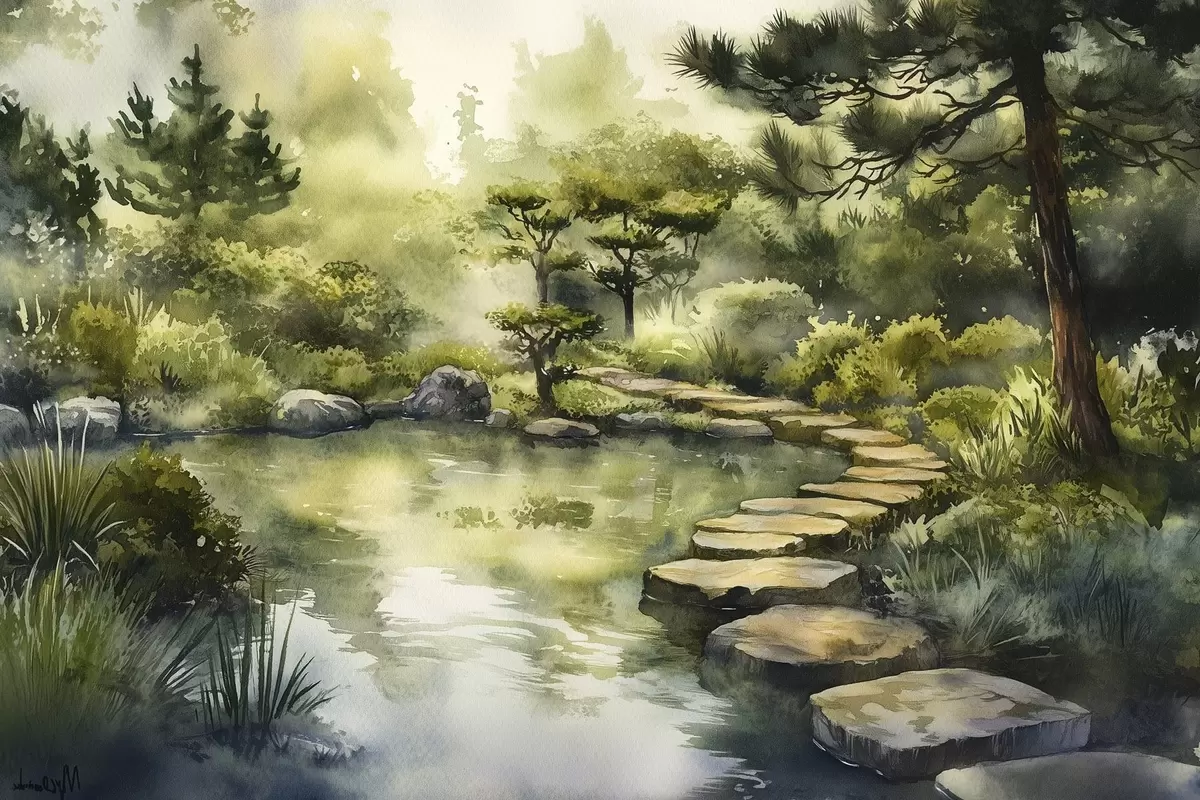 Plakatas Rytietiškas miškas su akmenimis, tvenkiniu ir pušimis, žaluma, akvarelės stilius f44311