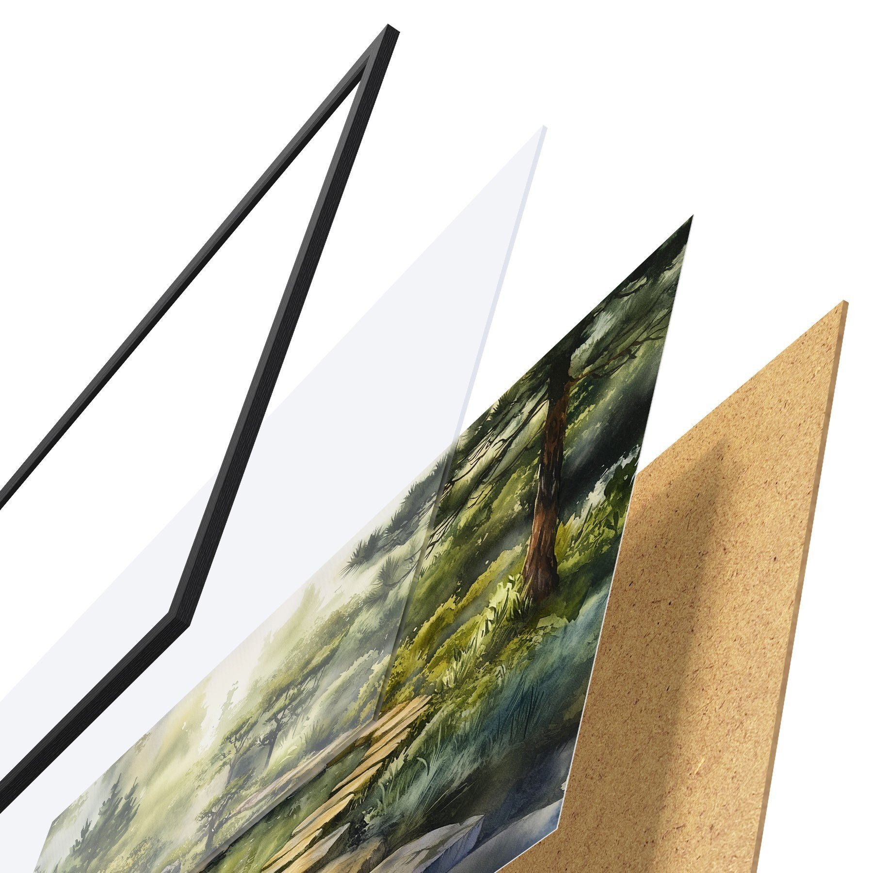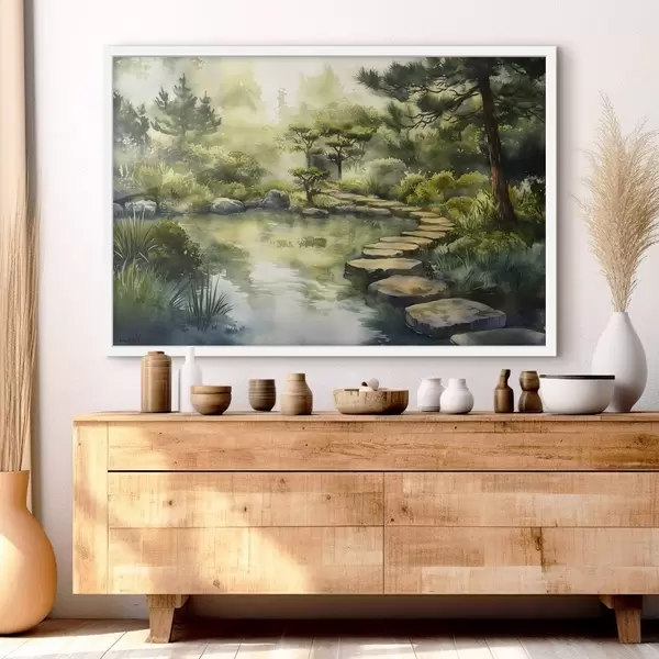 Plakatas Rytietiškas miškas su akmenimis, tvenkiniu ir pušimis, žaluma, akvarelės stilius Ne f44311